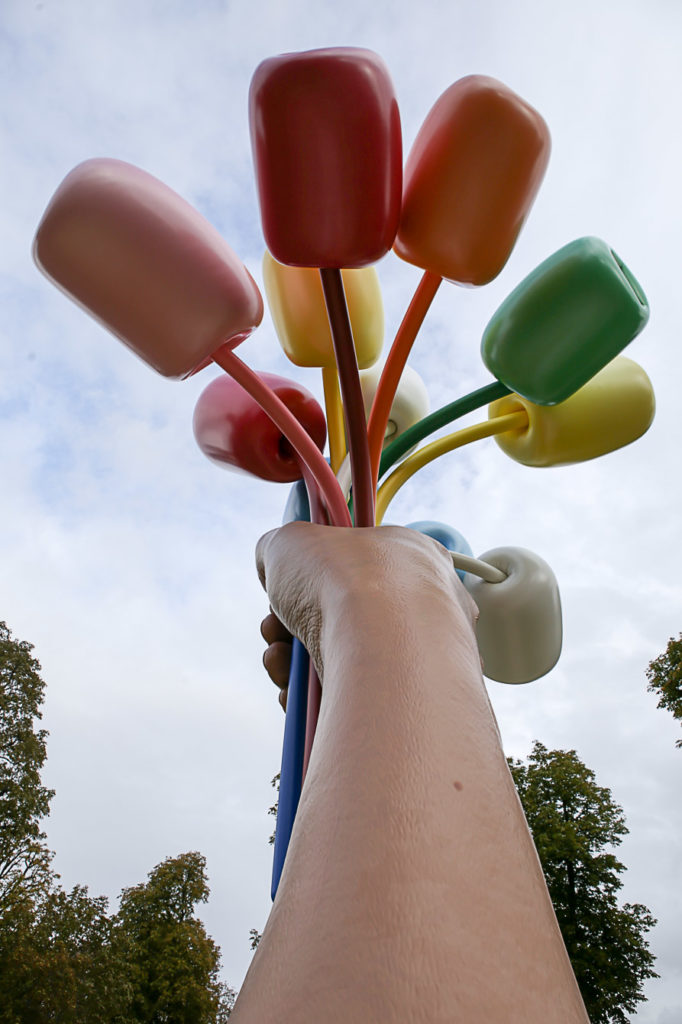 Cadeau ou pas cadeau, telle est la question, en attendant l’oeuvre contemporaine de Jeff Koons représente une main offrant un bouquet de tulipes.